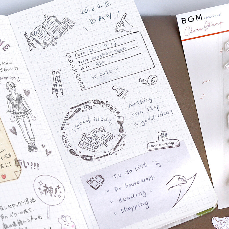 Easily decorate your notebook with this stationery-friendly collection of clear stamps.